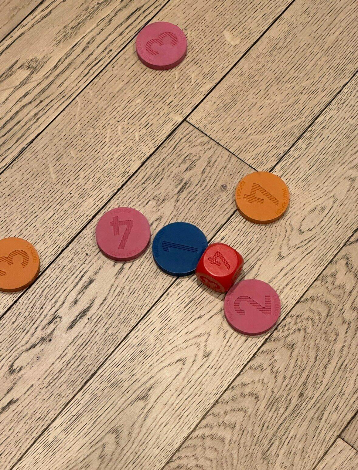 Chaque joueur tente de placer ses palets le plus près du dé. À la fin de la manche, seule une couleur marque. Additionnez la valeur de vos palets jusqu’au premier palet adverse. Si le total est égal à la valeur du dé, les points se multiplient, sinon ils s’ajoutent.